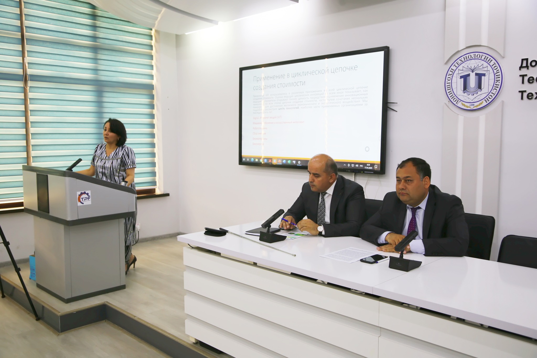 Сипас, гузоришҳои илмии муовини ректор оид ба татбиқи стратегияҳо ва рушди технологияҳои инноватсионӣ н.и.и., дотсент Ғафоров Ф.М. дар мавзӯи “Технологияҳои пешрафтаи иқтисодиёти даврӣ”, сардори идораи татбиқи стратегия ва технологияҳои инноватсионӣ Ҷафаров А.С. дар мавзӯи “Малакаҳои сабз дар рушди иқтисодиёти даврӣ” ва мудири шуъбаи таълим Мирзоев Ш.Т. дар мавзӯи “Нақши бизнес-моделҳо дар татбиқи иқтисоди даврӣ” шунида шуд.
